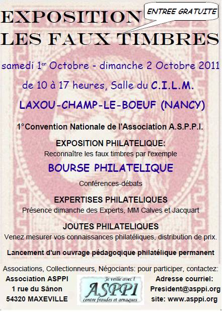L'association ASPPI, qui est en cours d'intégration dans la FFAP, vous propose la manifestation/Exposition "Les Faux Timbres" qui se déroulera les samedi 1er et dimanche 2 octobre 2011 à LAXOU-CHAMP-LE-BOEUF (Nancy). Cliquez sur le flyer ci-dessous pour obtenir toutes les informations.