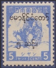 5c., outremer Y&T N°OC56 Herausgegeben von 1944 Surcharge sur 2 lignes signifiant "Burma State" et valeur sur la 2ème ligne |