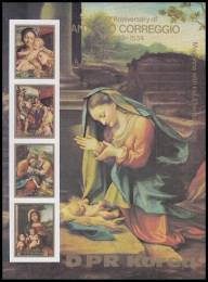 North Corea - Bloc-feuillet "450ème anniversaire de la mort du peintre Antonio Allegri, dit le Corrège" modify on 12.20.2025