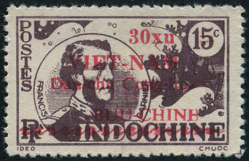30xu. sur 15c., brun-violet Y&T N°24 Issued on 1946 Timbre d'Indochine surchargé en rouge VIET-NAM Dan-Chu Cong-hoa BUU-CHINH |