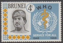 4c., bleu pâle, jaune et sépia Y&T N°143 Michel N°142 Emis en 1968 20e anniversaire de l'OMS Filigrane "Couronne et texte CA multiple couché" Dentelé 14 |
