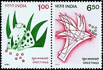 1r. + 6.50r., rose, vert et rouge Y&T N°1116-1117 Emis en 1991 - Grenouille dans l'herbe - Colombe en vol stylisée |