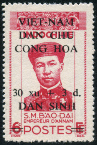 30xu.+3d. sur 6c., rouge Y&T N°38 Issued on 1946 Timbre d'Indochine surchargé VIET-NAM DAN-CHU CONG-HOA 30xu + 3d. DAN SINH |