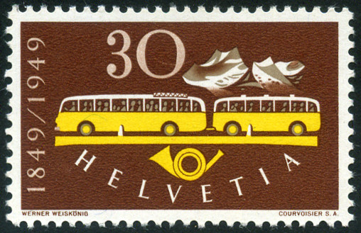 30c., brun, jaune et gris Y&T N°473 COB N°293 Emis en 1949 Centenaire des Postes confédérales Papier avec fragments de fils de soie Dentelé 11½ |