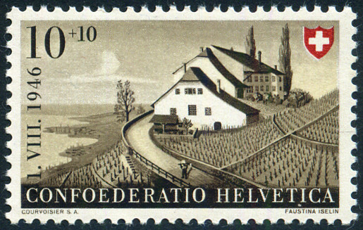 10c. + 10c., brun-noir et rouge Y&T N°429 COB N°B31 Emis en 1946 Fête nationale. Timbre émis au profit des Suisses résidant à l'étranger Papier avec fragments de fils de soie Dentelé 11½ |