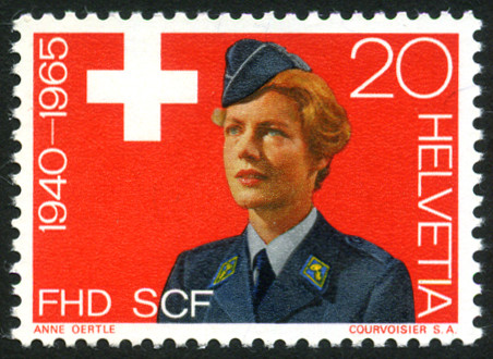 20c., rouge, bleu, brun et ocre Y&T N°745 COB N°430 Emis en 1965 Série de propagande. 25e anniversaire du Service complémentaire féminin Papier avec fragments de fils de soie Dentelé 11½ |