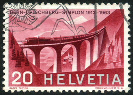 20c., rouge carminé Y&T N°707 COB N°397 Emis en 1963 Série de propagande. Cinquantenaire du chemin de fer du Lötschberg Papier avec fragments de fils de soie Dentelé 11½ |