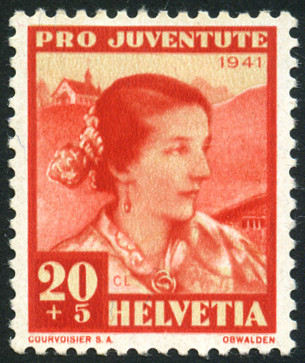 20c. + 5c., rouge et jaune Y&T N°373 COB N°J99 Emis en 1941 Timbres pour la jeunesse Papier avec fragments de fils de soie Dentelé 11½ |