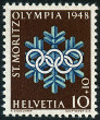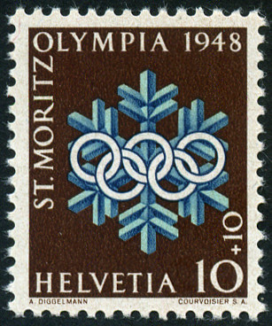 10c. + 10c., brun et bleu Y&T N°450 COB N°W26 Emis en 1948 Jeux olympiques d'hiver de Saint-Moritz Papier avec fragments de fils de soie Dentelé 11½ |