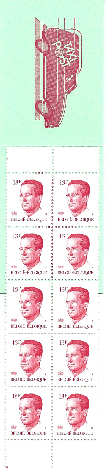 130f., rouge carminé Y&T N°CA2202 COB N°B18 P5b-V Emis en 1986 Carnet émis le 22/09/1986 Voiture vers le haut 10 x Baudouin de type Velghe - 13F rouge |