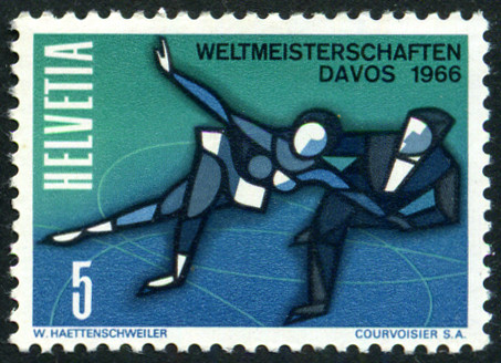 5c., vert, gris et bmeu Y&T N°755 COB N°438 Emis en 1965 Championnats du monde de patinage artistique, à Davos (1966) Papier avec fragments de fils de soie Dentelé 11½ |