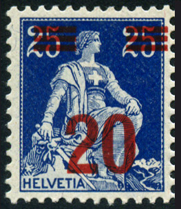 20c. sur 25c., bleu Y&T N°184 COB N°151 Emis en 1921 Timbre avec surcharge rouge Papier avec fragments de fils de soie Filigrane croix Dentelé 1½x11 ou 11½x12 |