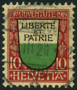 10(+5)c., rouge, noir et vert Y&T N°174 COB N°J13 Emis en 1919 Pour la jeunesse Papier avec fragments de fils de soie Filigrane croix Dentelé 11½ |