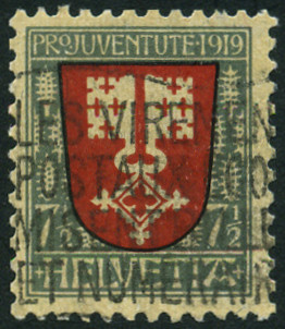 7½(+5)c., gris, noir et rouge Y&T N°173 COB N°J12 Emis en 1919 Pour la jeunesse Papier avec fragments de fils de soie Filigrane croix Dentelé 11½ |