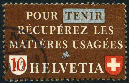 10c., brun et bleu Y&T N°375 COB N°255 Emis en 1942 Timbres de propagande pour la récupération Papier avec fragments de fils de soie Dentelé 11½ |