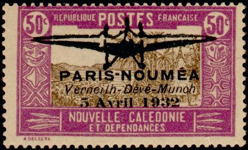 50c., lilas et sépia Y&T N°PA2 Emis en 1932 1ère liaison aérienne France - Nelle-Calédonie. T.-Poste de 1928-38 |