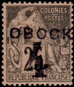 4c., sur 25c. noir sur rose Y&T N°25 Emis en 1892 T.-Poste de 1892 avec nouvelle valeur en surcharge |