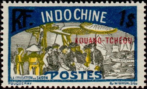 1pi., bleu, noir et jaune Y&T N°95 Emis en 1927 T.-Poste d'Indochine de 1927 surchargé |