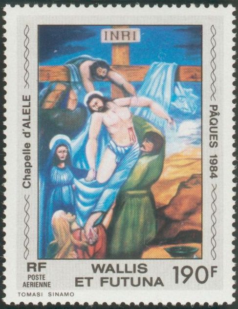 190f., polychrome Y&T N°PA135 emitida el 1984 Poste Aérienne Pâques. Peinture de la chapelle d'Alèle |