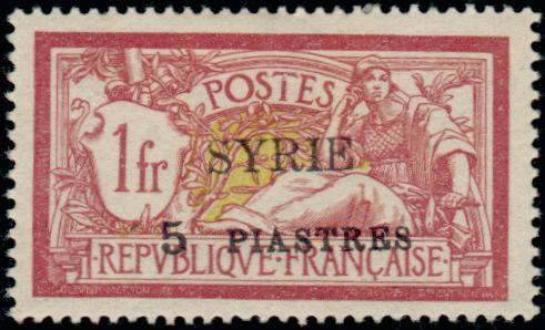 5pi., sur 1fr. lie de vin et olive Y&T N°116 Emis en 1924 T-P de France de 1900-21 surch. SYRIE |
