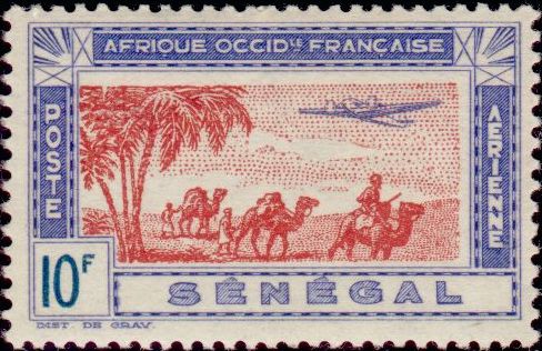 10f., outremer et carmin Y&T N°PA27 Emis en 1942 Poste Aérienne Avion survolant une caravane sans R.F. |