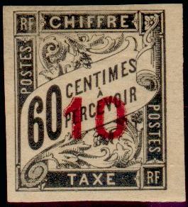 10c., sur 60c. noir Y&T N°TA3 Emis en 1905 Timbre Taxe T.-Taxe des Colonies de 1884 surchargé |