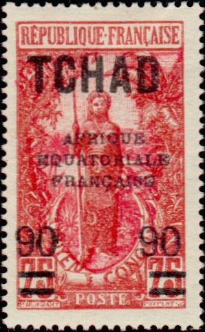 90c., sur 75c. brique et rouge-carmin Y&T N°47 Emis en 1926 T.-Poste de 1922 surchargé "A.E.F." et nouvelle valeur |