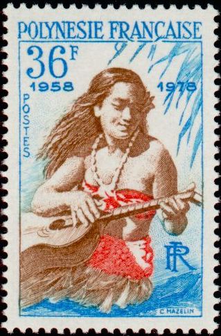 26f., turquoise, rouge et brun Y&T N°123 Emis en 1978 20° anniv. de la 1ère émission de timbre-poste de Polynésie |