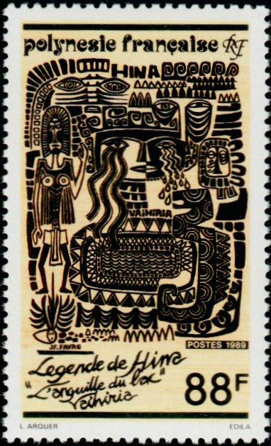 88f., jaune et noir Y&T N°349 Emis en 1989 Légendes polynésiennes. Illustration dans le style gravure sur bambous |