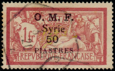 50pi., sur 1fr. lie de vin et olive Y&T N°42 Emis en 1920 T-P de France de 1900-06 surch. O.M.F. Syrie |