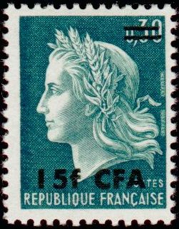 15f., sur 30c. vert Y&T N°384 Emis en 1969 T.-Poste de France surchargés CFA |