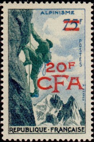 20f., sur 75f. bleu, ardoise et vert Y&T N°330 Emis en 1955 T.-Poste de France de 1955-56 surchargés CFA |