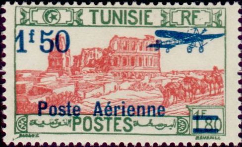 1f.50, sur 1f.80 vert-gris et rouge Y&T N°PA11 Emis en 1930 Poste Aérienne T.-Aérien de 1928 surchargé |