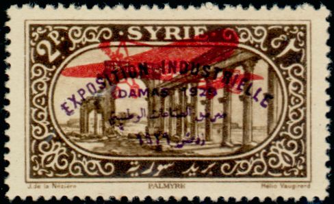 2pi., sépia (30) Y&T N°PA45 Emis en 1929 Poste Aérienne Exposition industrielle de Damas. Timbres de 1926-29 surchargés |