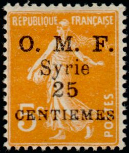 25c., sur 5c. orange Y&T N°85 emitida el 1922 T-P de France de 1900-21 surch. O.M.F. Syrie |