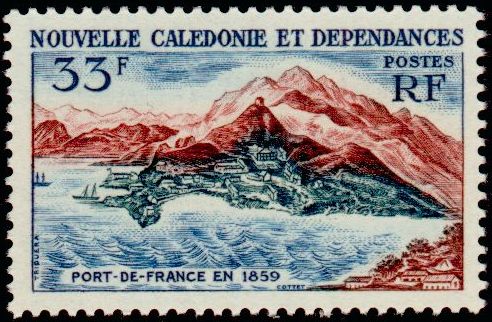 33f., bleu, rouge-brun et vert-bleu Y&T N°301 Emis en 1960 Centenaire de la poste et du timbre néo-calédoniens |