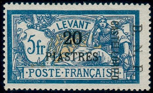 20pi., sur 5f. bleu et chamois Y&T N°13 Emis en 1920 T.-Poste du Levant de 1902-20 surchargé |
