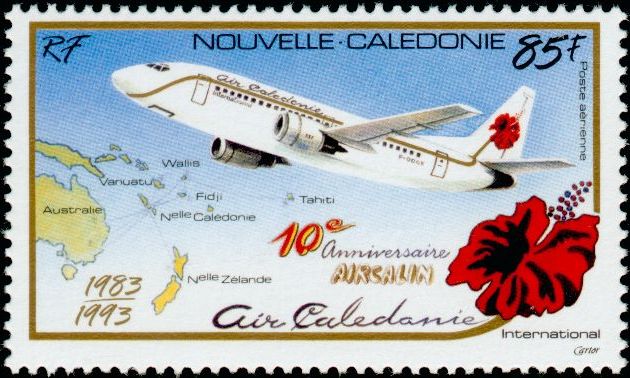 85f., polychrome et or Y&T N°PA305 Emis en 1993 10° anniv. de la création d'"Aircalin" (Air Calédonie International) |