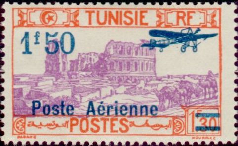1f.50, sur 1f.30 rouge-orange et violet Y&T N°PA10 Emis en 1930 Poste Aérienne T.-Aérien de 1928 surchargé |