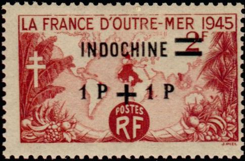 1pi.+1pi., sur 2f. brun-carmin Y&T N°297 Issued on 1945 Type de France de 1945 surchargé |