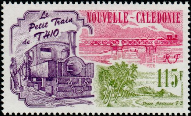 115f., rose, vert-jaune et violet Y&T N°PA301 Emis en 1993 Le petit train de Thio |
