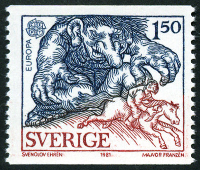 1,50Kr., lilas rouge et noir bleu Y&T N°1123 Emis en 1981 Dentelé 12¾ Taille-douce AnimauxEuropa |