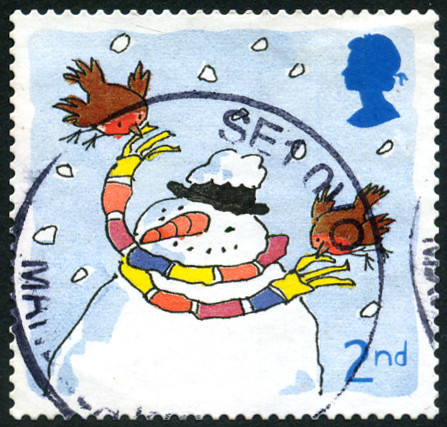 Grande Bretagne - Rouges-gorges posant une écharpe sur un bonhomme de neige