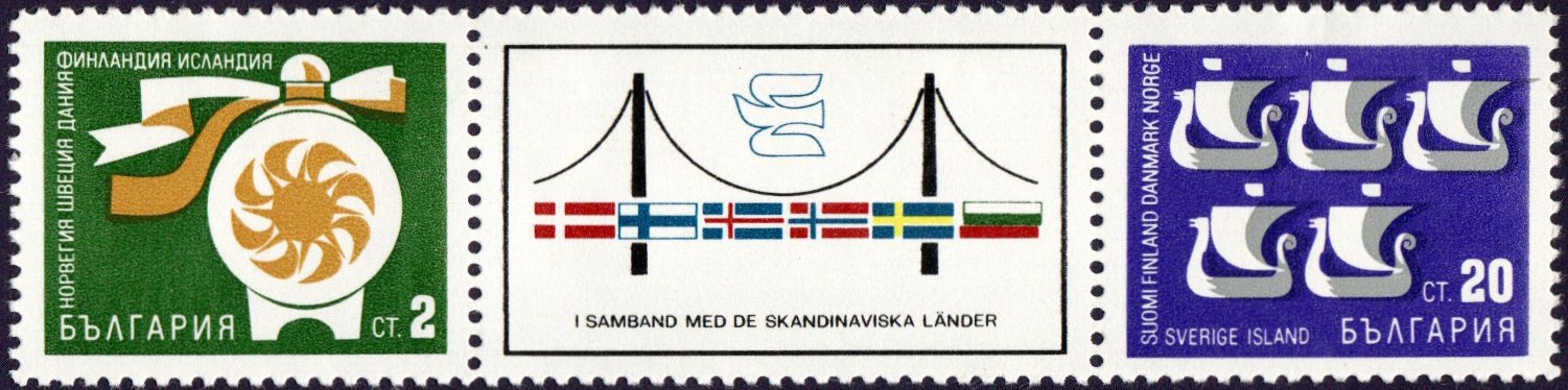 Bulgarie - Coopération avec les pays scandinaves - Emis avec vignette centrale représentant les 6 pays (colombe - pont et drapeaux)
