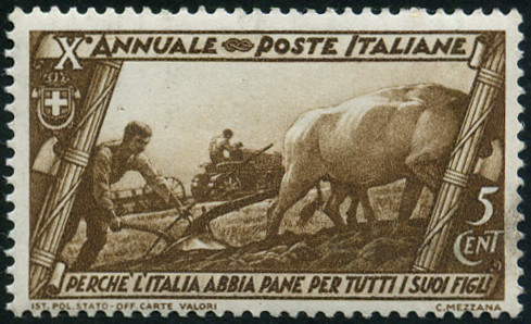 5c., brun Y&T N°305 Michel N°325 emitida el 1932 Dentelé 14 Filigrane couronne 10e anniversaire de la marche sur Rome |