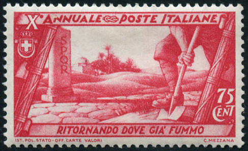 75c., rose-rouge Y&T N°314 Michel N°334 Issued on 1932 Dentelé 14 Filigrane couronne 10e anniversaire de la marche sur Rome |