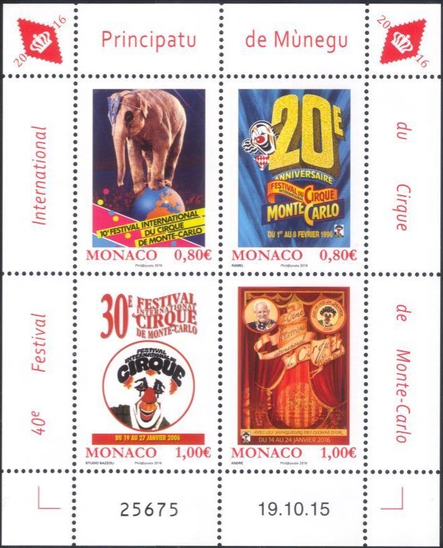 3,60¤, polychrome Y&T N°3011-14 Issued on 2016 Affiches du 10eme, 20eme, 30eme, et 40eme festival du cirque de Monte Carlo |