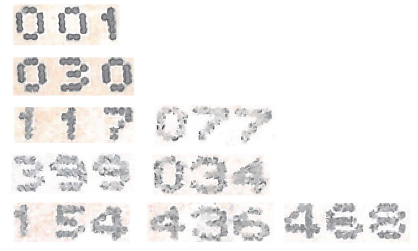 En regardant le scan joint, vous pouvez voir que les numéros de la colonne de GAUCHE 001-030-117-399-154 sont de la même écriture (certains sont nets car ils sont neufs, les autres + ou - flous car oblitérés et donc décollés dans l'eau ou la vapeur).
