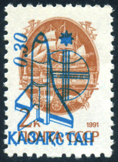 30k. sur 2k., bistre-orange Y&T N°6B Emis en 1992 Timbre de Russie surchargé avec nom du pays et pictogrammes navette spatiale et globe |